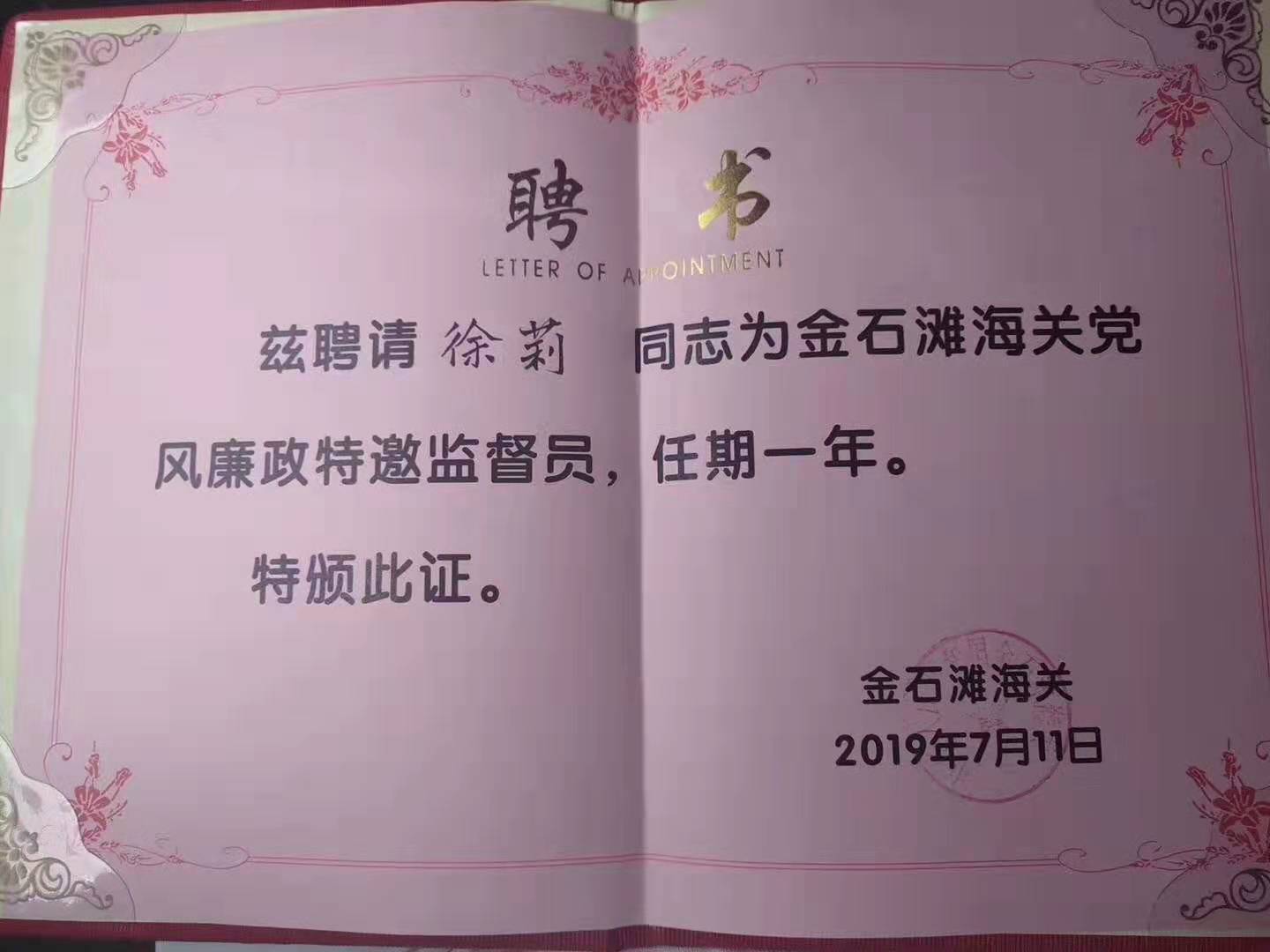 徐總被聘請為金石灘海關黨風廉政特邀監督員